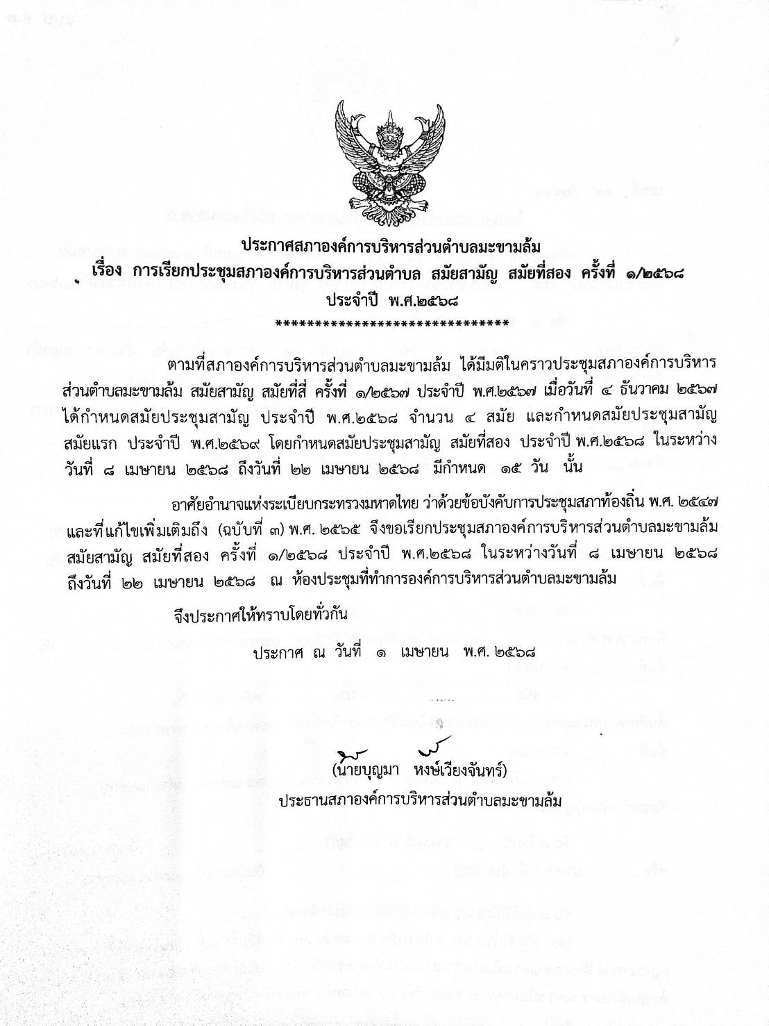 ประกาศสภาองค์การบริหารส่วนตำบลมะขามล้ม เรื่อง การเรียกประชุมสภาองค์การบริหารส่วนตำบล สมัยสามัญ สมัยที่สอง ครั้งที่ 1/2568 ประจำปี พ.ศ.2568